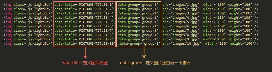 <img class='js-lightBox' data-title='**' data-group='*' src="images/**.jpg" />