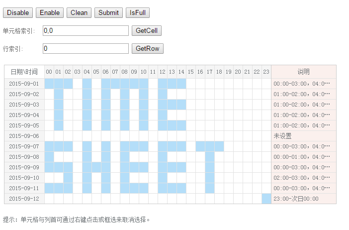 // TimeSheet has to be binded on a TBODY element var sheet = $("#aTbodyElement").TimeSheet({ data: { dimensions : [2,3], colHead : [{name:"00",title:"00:00"},{name:"01",title:"01:00"},{name:"02",title:"02:00"}], rowHead : [{name:"2015-09-01"},{name:"2015-09-02"}], sheetHead : {name:"日期\\时间"}, sheetData : [[0,1,1],[1,1,1]] } });TimeSheet.js relies on jQuery, so jQuery must be included in your page before TimeSheet.js.